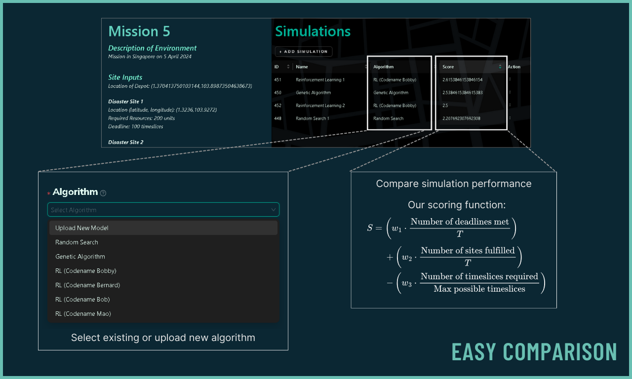 IntellAgent offers a wide range of algorithms, such as Reinforcement Learning (RL) and Genetic Algorithms (GA). The performance of the simulations are then evaluated with a score for quick comparison.