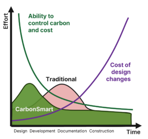 Targeting efforts at the early design stages ensures sustainability and embodied carbon is considered from the start, minimising downstream embodied carbon impacts and costly design changes.