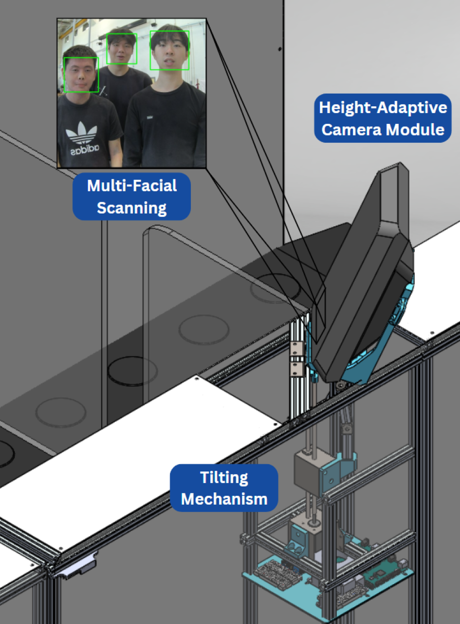 This subsystem obtains the number of passports scanned at the front of the gate from the connected database and confirms with the number of faces detected with the camera. If the detected number of faces and the number scanned passports do not match, the Height-Adaptive Camera subsystem will shift accordingly to capture the missing faces for biometric authentication.