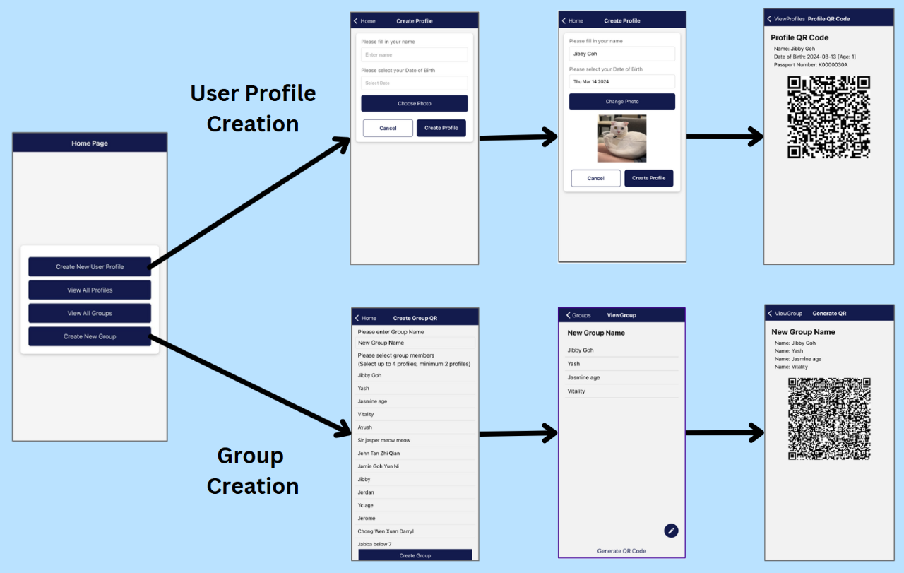 The QR Passport Generation app simplifies group travel documentation and streamlines identification processes by leveraging QR code technology, allowing users to pre-generate QR codes that aggregate individual passport details into a single, scannable code for use during group travel.