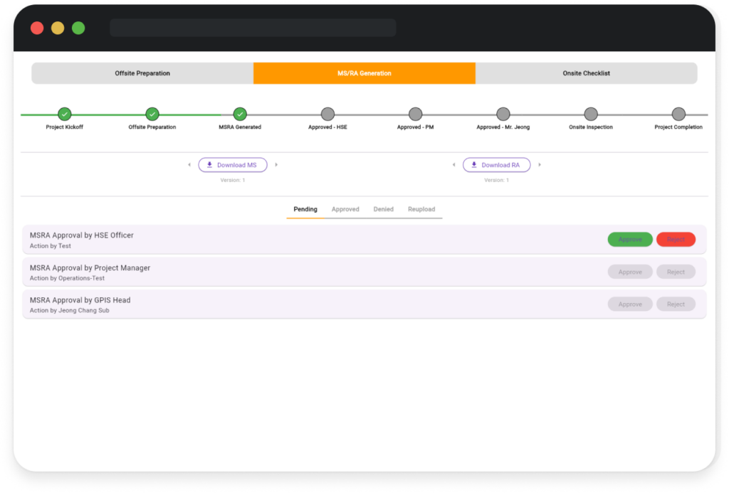 The ‘MSRA Generation’ streamlines the end-to-end creation of Method Statements and Risk Assessments by combining two subsystems: the Document Analyzer and the Template Engine. The Document Analyzer automatically extracts and refines key information from vendor-submitted MSRA documents using intelligent text matching, then stores it in a structured database. The Template Engine then populates standardized MSRA templates with this data. This ensures accuracy and faster approvals across projects.