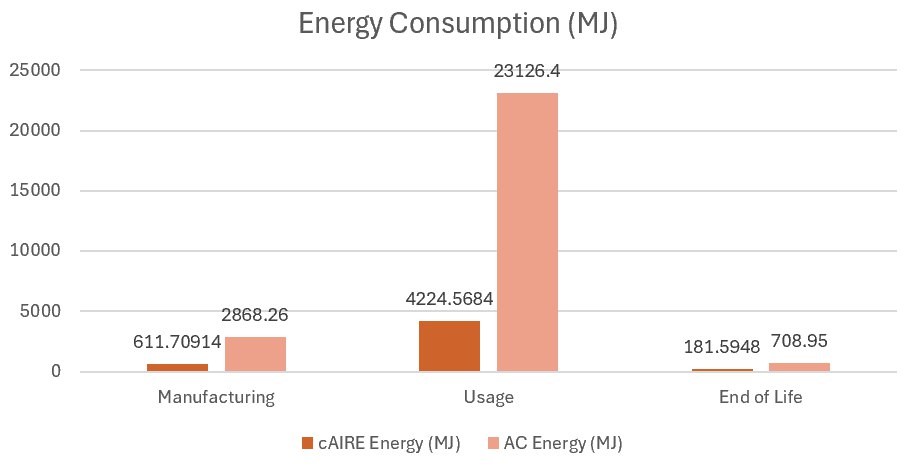 cAIRE is revolutionary in the world of sustainability, as it provides efficient cooling while being greener and more sustainable than current cooling solutions. Comparisons with other systems, such as air conditioners, show staggering differences. For comfort cooling paired with humidifying properties, cAIRE offers a sustainable and energy-saving solution.