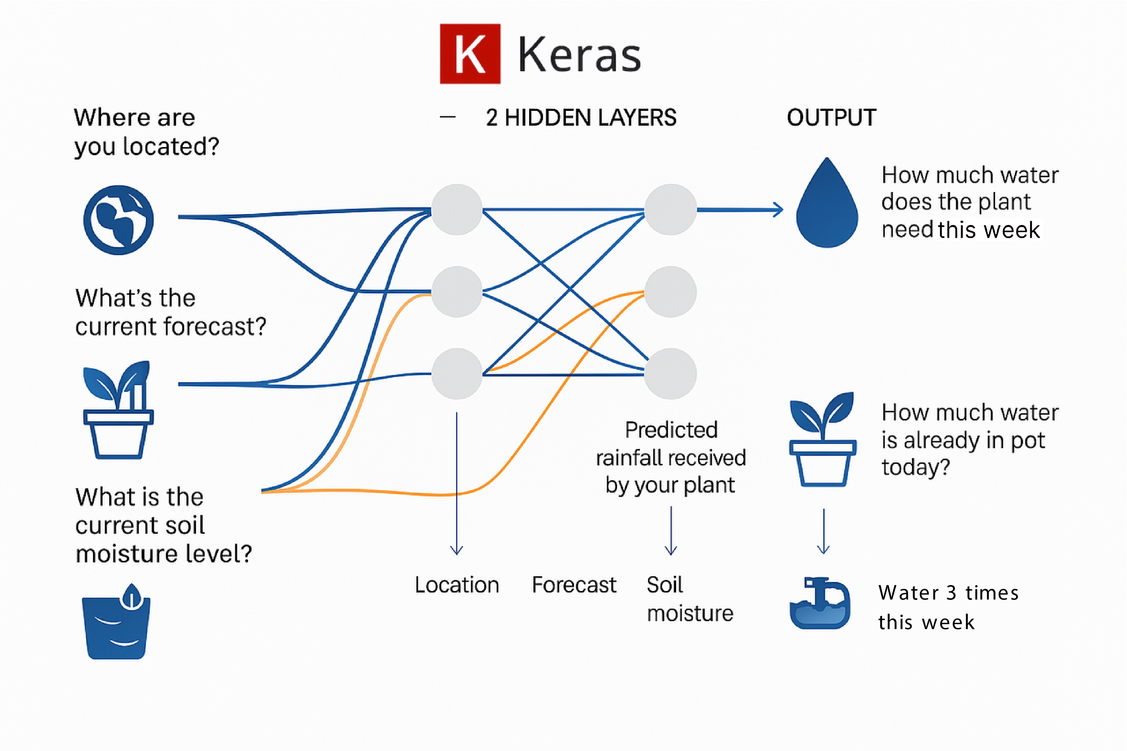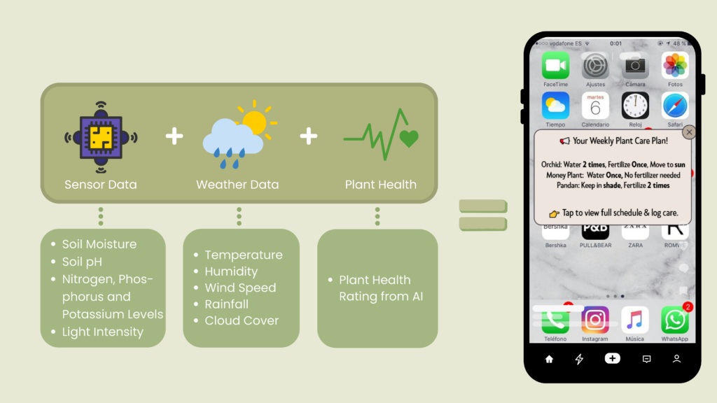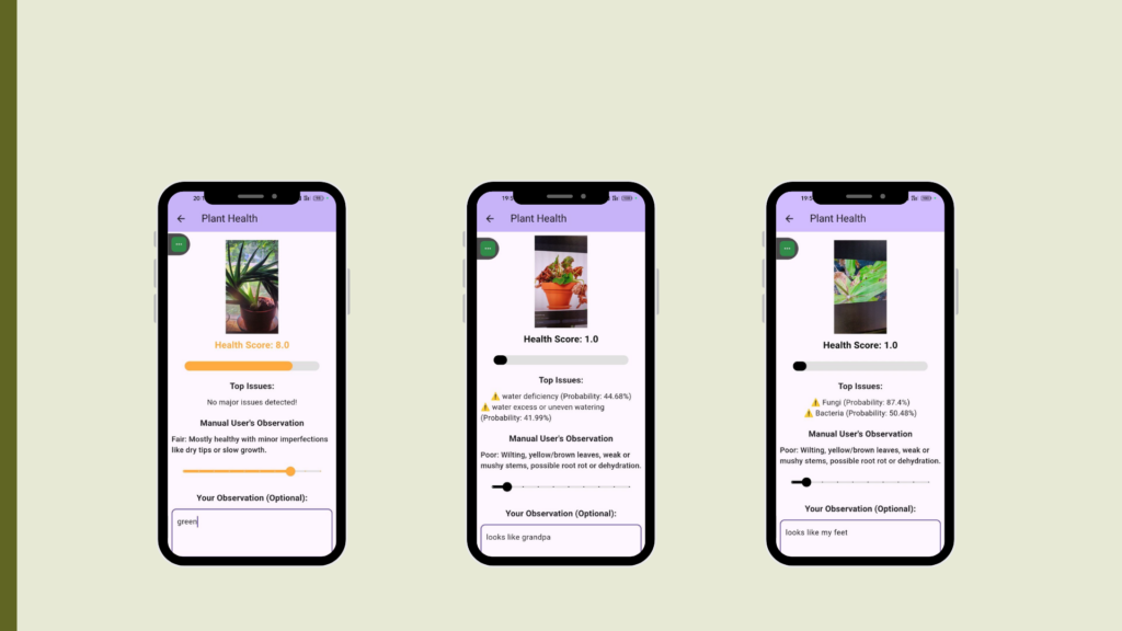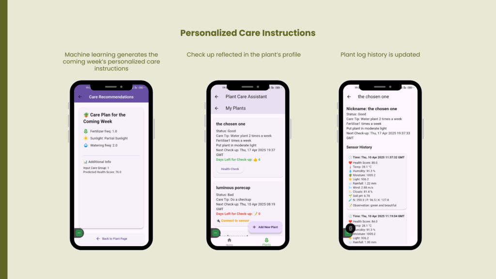 Fruitful’s core intelligence comes from a machine learning model that blends real-time weather data with insights gathered from our community of users. The app pulls live weather information from online sources, including temperature, rainfall, humidity, and sunlight levels. At the same time, users regularly rate their plant’s health and record care routines within the app. This creates a valuable dataset linking plant conditions with environmental factors and user actions.