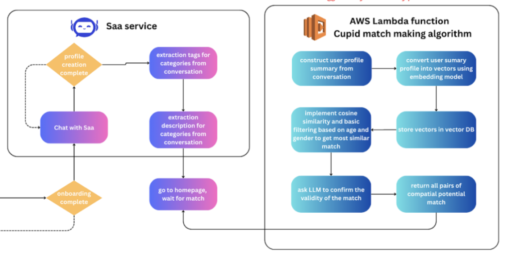 Cupid transforms personality summaries into match-ready data by first converting them into vector representations using a large-text embedding model. These vectors capture the unique personality fingerprint of each user. Every five minutes, a serverless AWS Lambda function is triggered to scan the database for available users. It computes similarity scores between profiles to identify and generate the most compatible matches. Once identified, the matches are logged in the backend and notifications are dispatched via in-app alerts or SMS.