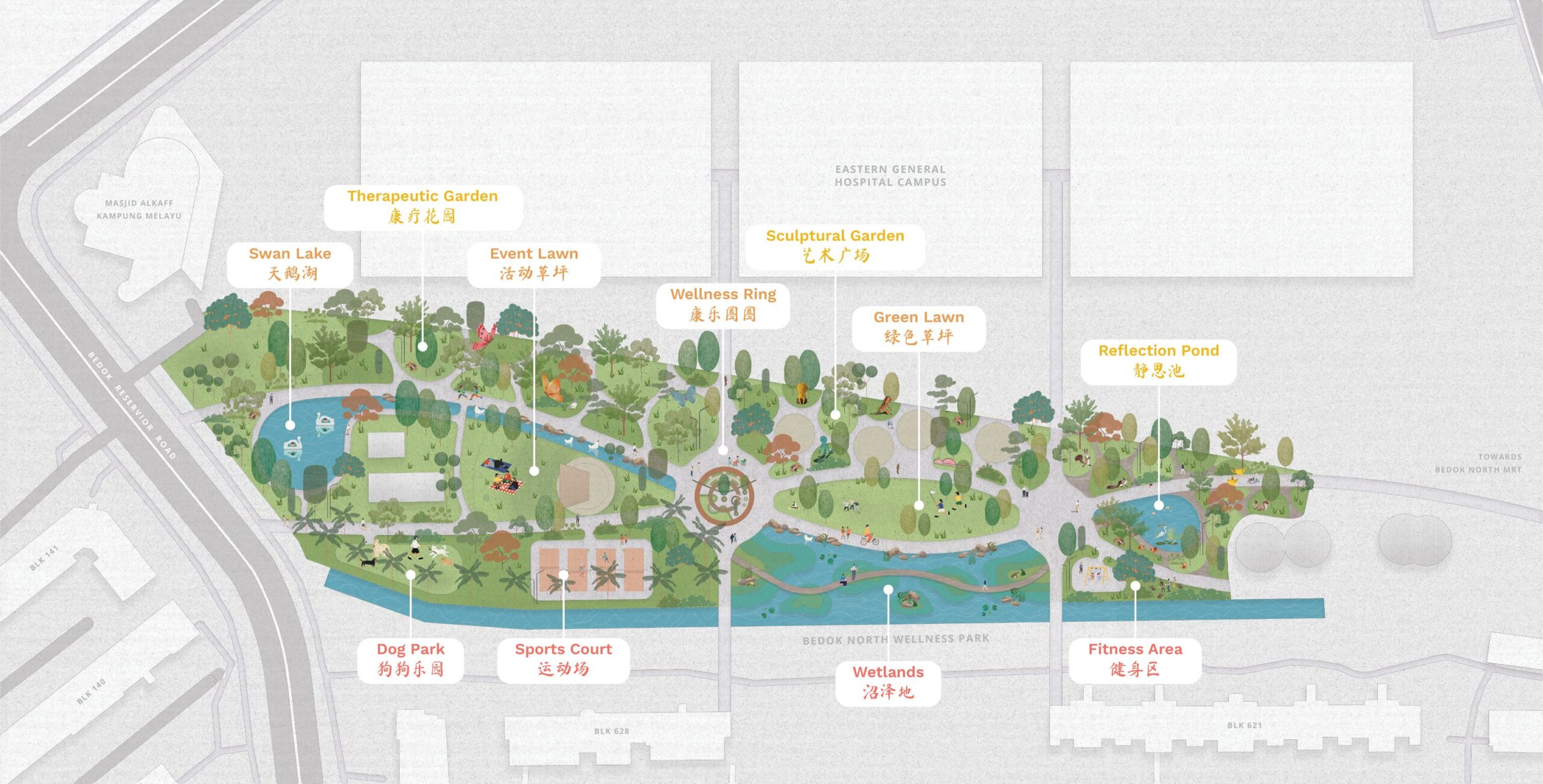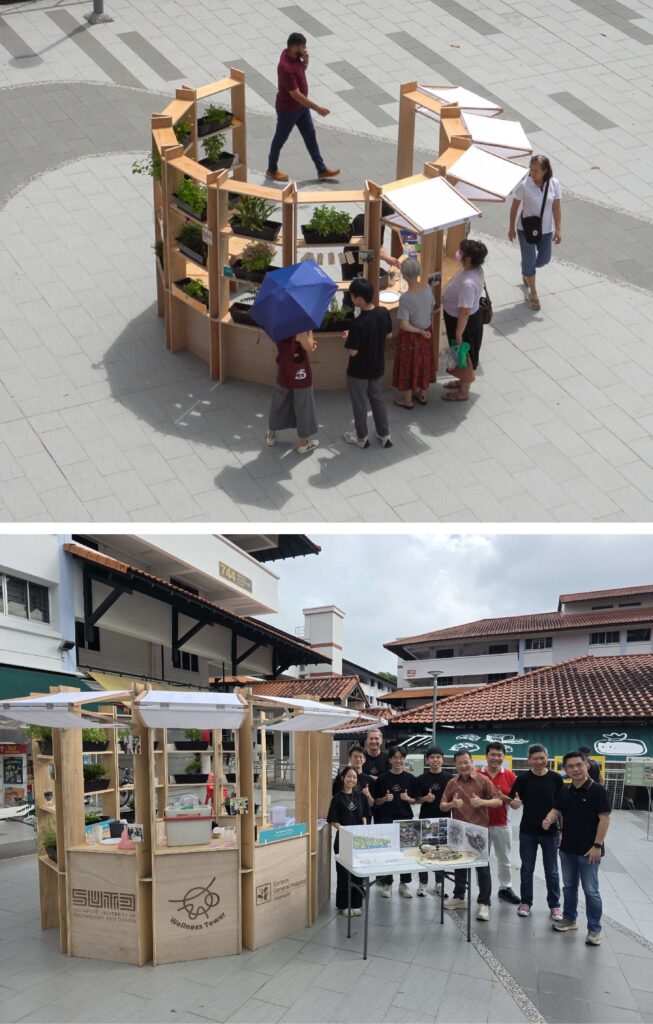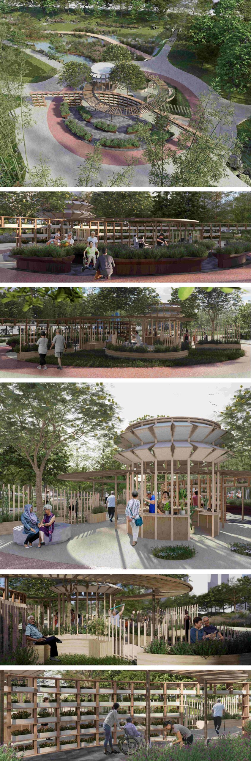 The Contemplative Wall offers a tranquil, nature-immersed corner within the Wellness Ring. Featuring seating integrated with planters and vertical bamboo screens, it provides a peaceful retreat from surrounding activities.