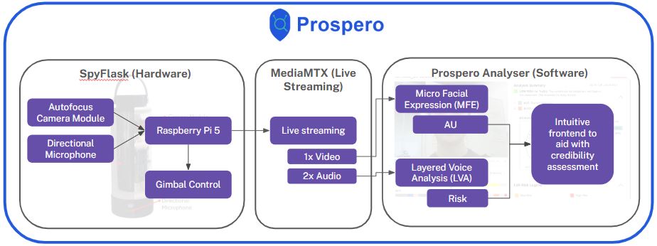 The video and audio inputs are live streamed from SpyFlask to Prospero Analyser. It is the bridge between our hardware and software. Below, the detailed system architecture shows the technologies we used and interactions between our individual components as well as the data flow path.