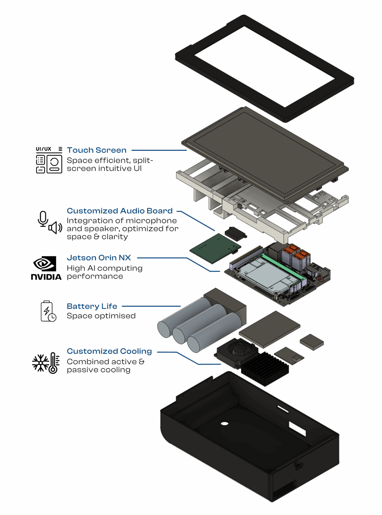 The compute unit handles intensive processing entirely offline and locally, ensuring high security without relying on cloud services or Wi-Fi. The audio board is designed for clear speech capture, enhancing translation accuracy, while the speaker ensures clear audio output. A custom cooling system maintains peak performance under demanding workloads, and the touchscreen provides an intuitive user experience. With a battery capable of 3.5 hours of continuous AI-powered speech translation, our meticulously integrated design offers a reliable, low cost, high-performance solution for seamless communication.