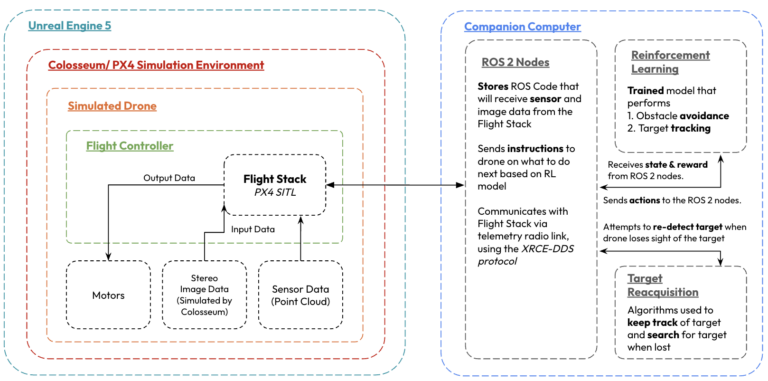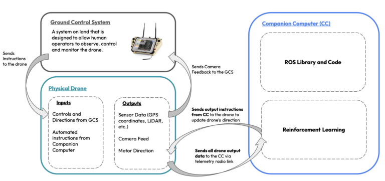 In a physical system, the drone is controlled from a Ground Control System paired with a companion computer that is able to process the telemetry data from the drone’s sensors.