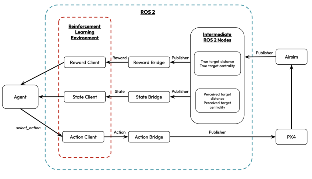 To train our Agent, intermediate nodes were setup to process and relay information between the simulation and the agent. These intermediate nodes extract data from the simulation environment, and makes it accessible to the reinforcement learning environment, which will provide the values for state and reward during training. This is then sent to our Agent which would calculate the next action for the drone. This command is then relayed back to the drone through the ROS2 nodes to the PX4 controller for execution