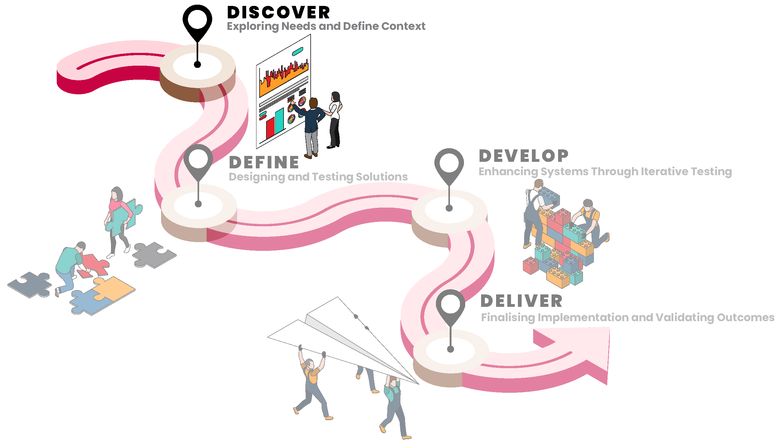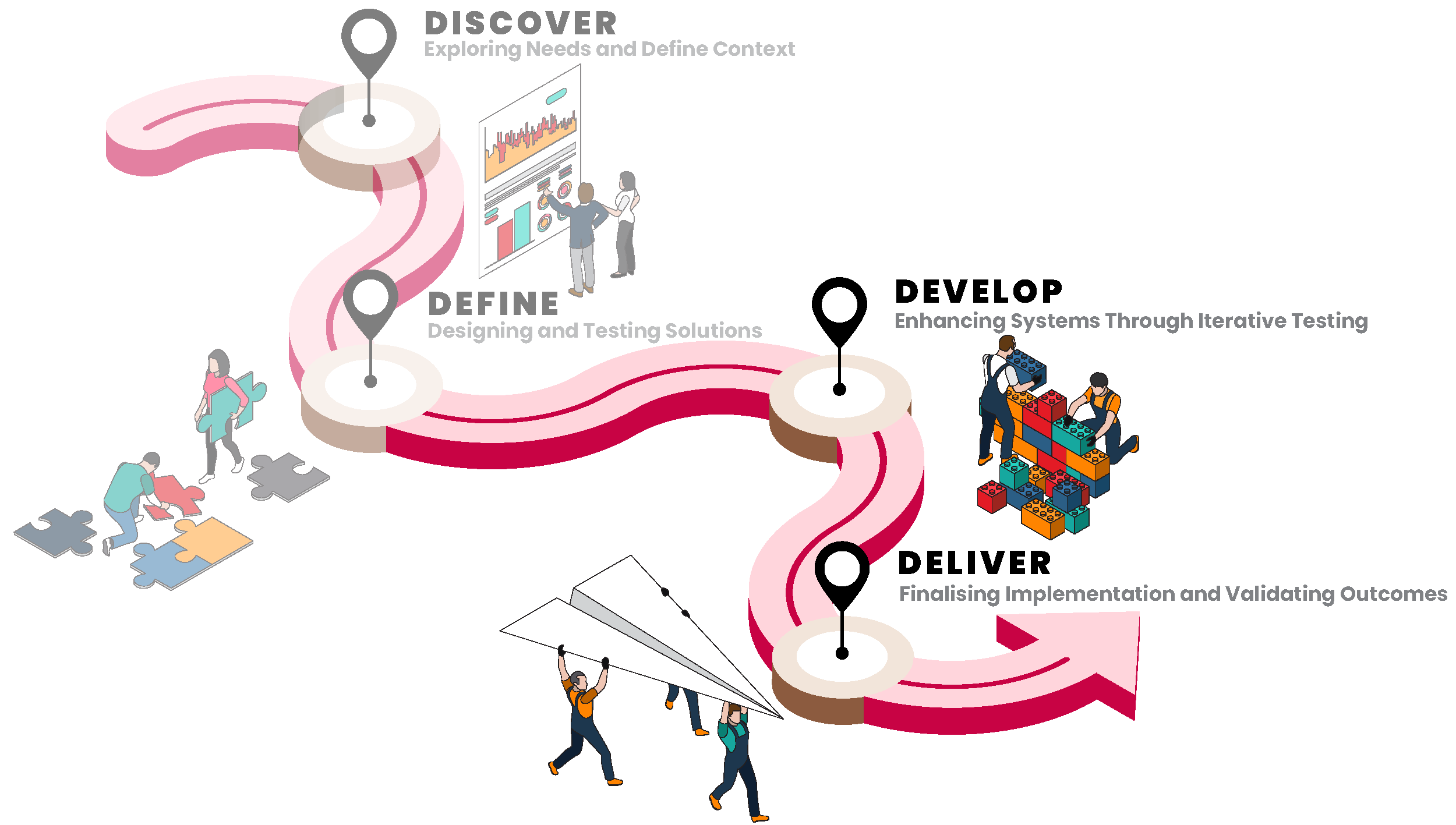 The Discover Phase focused on exploring and understanding the problem. It involved conducting a comprehensive needs analysis to identify opportunities and challenges, gathering insights through site visits, and exploring other existing technologies. During this phase, the needs statement was defined, the problem context was mapped, and the project was structured into iterative phases enabling a systematic approach to problem-solving.
