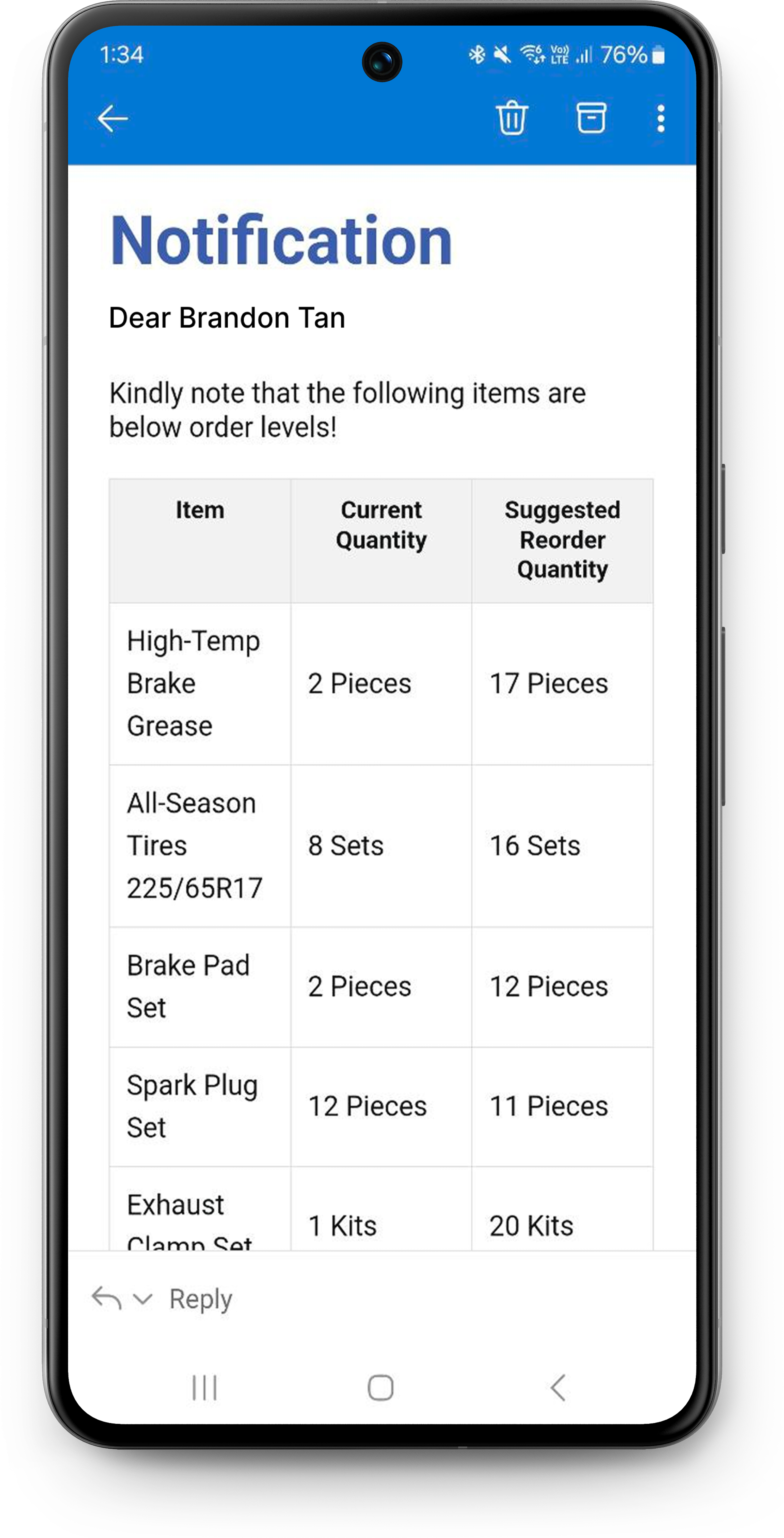 Low stock items are flagged clearly, and email notification is sent whenever stock is low.