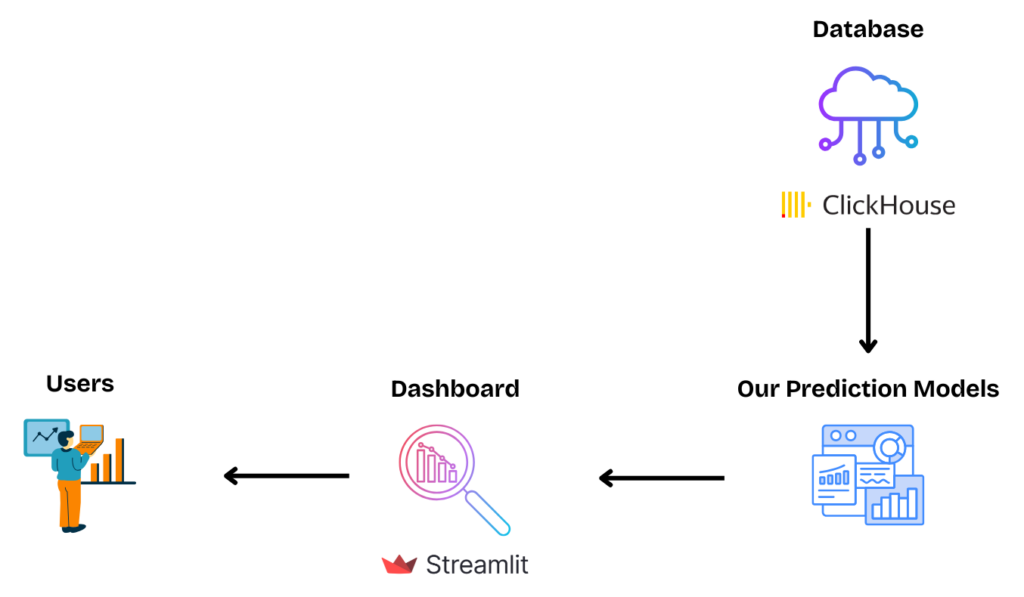 Our system integrates financial data sourced from NASDAQ and FRED, which is stored and managed in a high-performance ClickHouse database. From there, the data is fed into our custom-built volatility prediction models, designed to forecast market behavior with greater accuracy than traditional benchmarks like implied volatility.