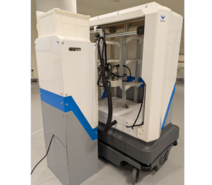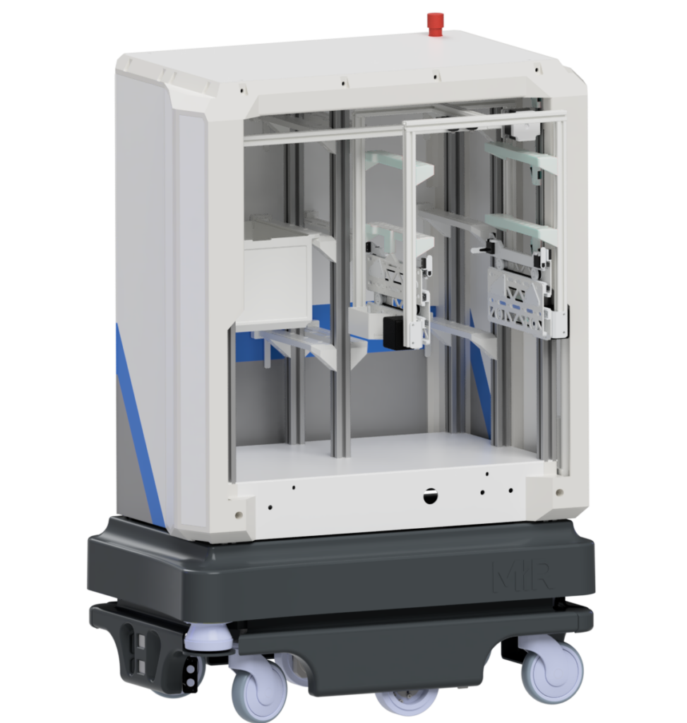 The Top Unit is mounted on the MiR base and handles container transfer during delivery.