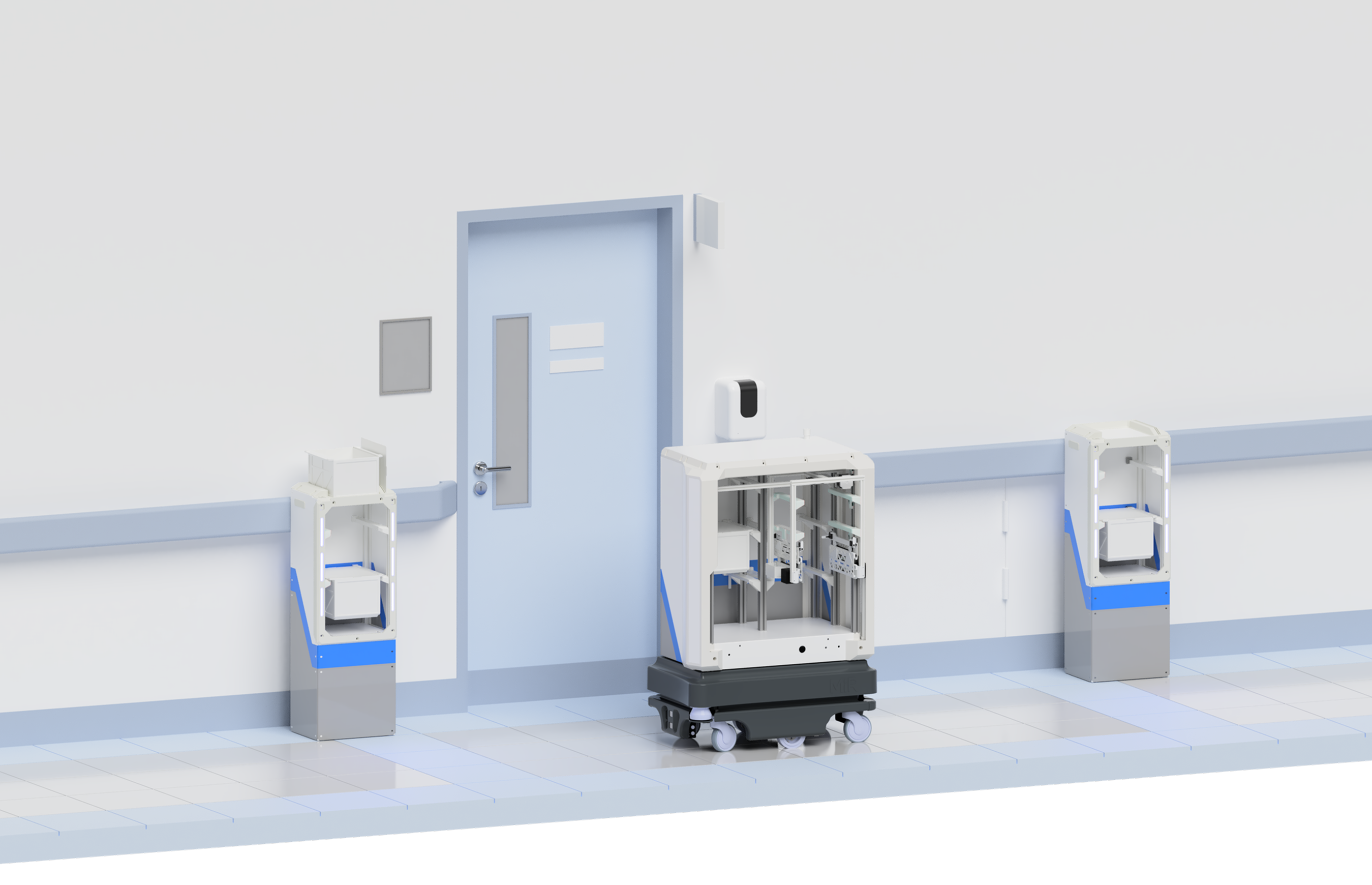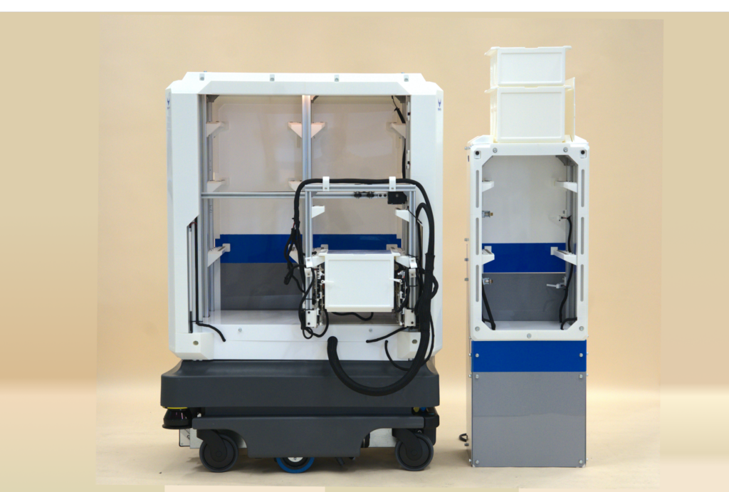 The robot navigates independently between these stations, enabling seamless, autonomous cross-departmental transfers of essential goods via a Top Unit that autonomously handles container movement.