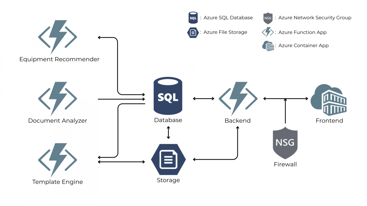 Our project management web application integrates three core subsystems—the Equipment Recommender, Document Analyzer, and Template Engine—each deployed as Azure Function Apps, interacting directly with an Azure SQL Database and Azure File Storage. The SQL Database functions as the central structured data repository and Azure File Storage complements this by managing unstructured data. The backend manages data retrieval and business logic, connecting to the database and storage, and communicates with the frontend, deployed as an Azure Container App. Security is enforced through an Azure Network Security Group (NSG) to safeguard communication between components.
