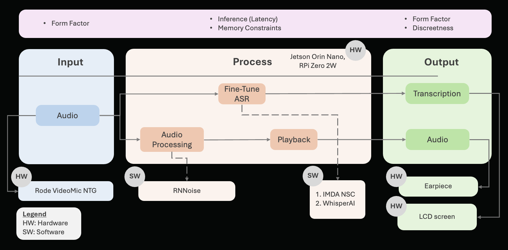 - Processor: Contain the computer (Jetson Orin Nano) and its battery for speech processing locally. It features a quick Swap (40s) using lithium-ion batteries (lifespan of 4.25hrs). It is also discreet at 0.936kg, inside of a small satchel bag.